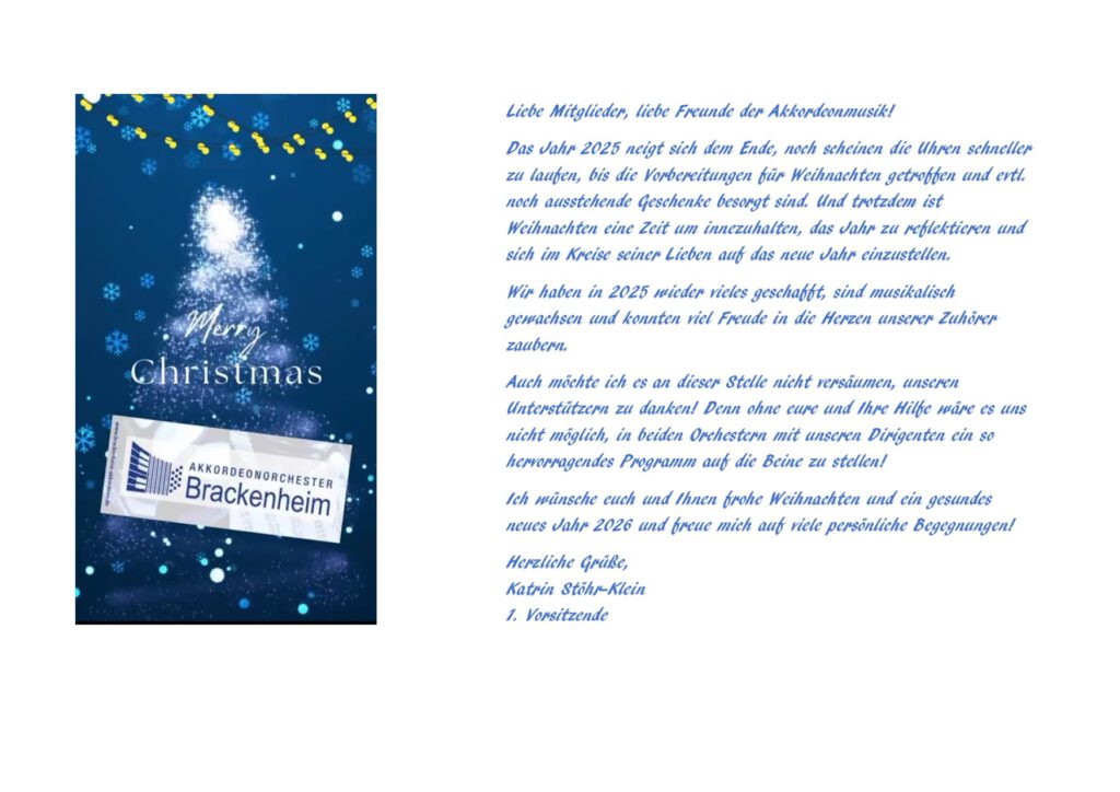 Das Akkordeonorchester Brackenheim e.V. mit all seinen Gruppierungen wünscht ein gesundes neues Jahr! Wir freuen uns schon wieder auf zahlreiche Möglichkeiten in 2025 um für- und miteinander zu musizieren.