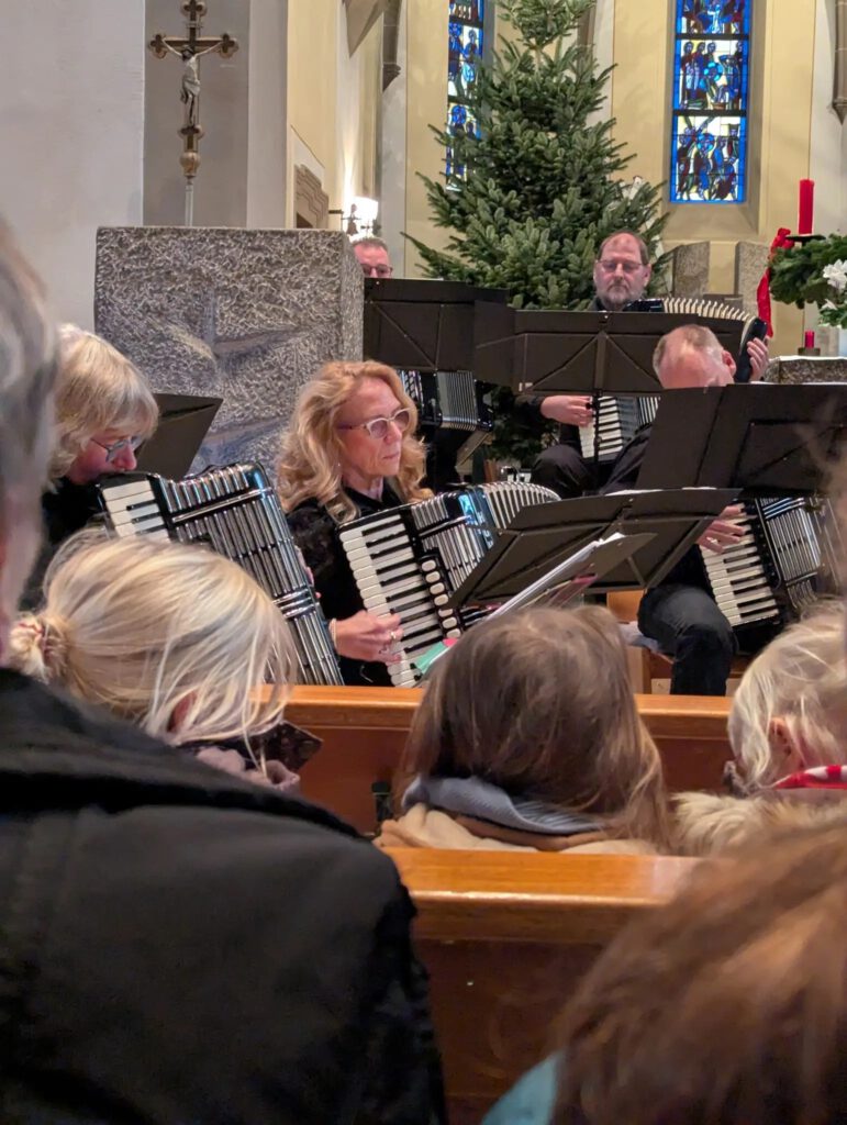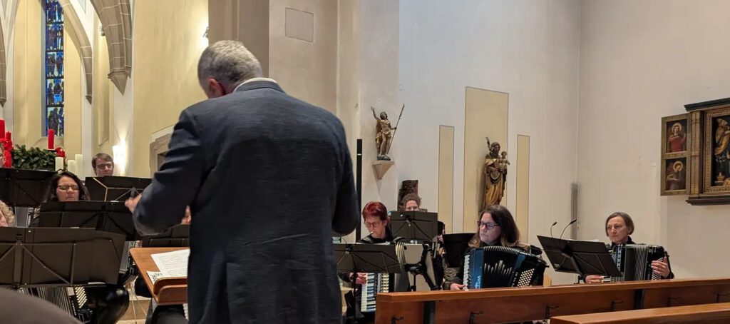 Unter der Leitung von Marion Bammert präsentierten die rund 20 Musikerinnen und Musikern an Akkordeon, Klavier, E-Piano, Bassakkordeon und Bassgitarre, Schlagzeug und Pauken und sogar einer Geige ein abwechslungsreiches Programm mit beliebten Stücken aus Film und Musical, Rock und Pop. Die Auswahl reichte von unvergesslichen Melodien von ABBA, Udo Jürgens und Queen bis hin zu modernen Klängen wie „James Bondes – Skyfall“, den „Pirates of the Carribean“ oder dem Kult-Musical „Tanz der Vampire“, die das Publikum in die wunderbare Welt der Musik entführten. Die Klänge des Akkordeons, in harmonischem Zusammenspiel, zauberten ein eindrucksvolles Klangerlebnis, das die Zuhörer sichtlich begeisterte und überraschte, wie abwechslungsreich die Akkordeonmusik tatsächlich ist.